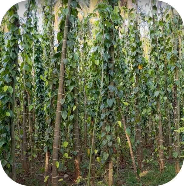 Advantages: Pepper benefits from natural shade and organic matter. System conserves biodiversity and reduces monoculture risks.